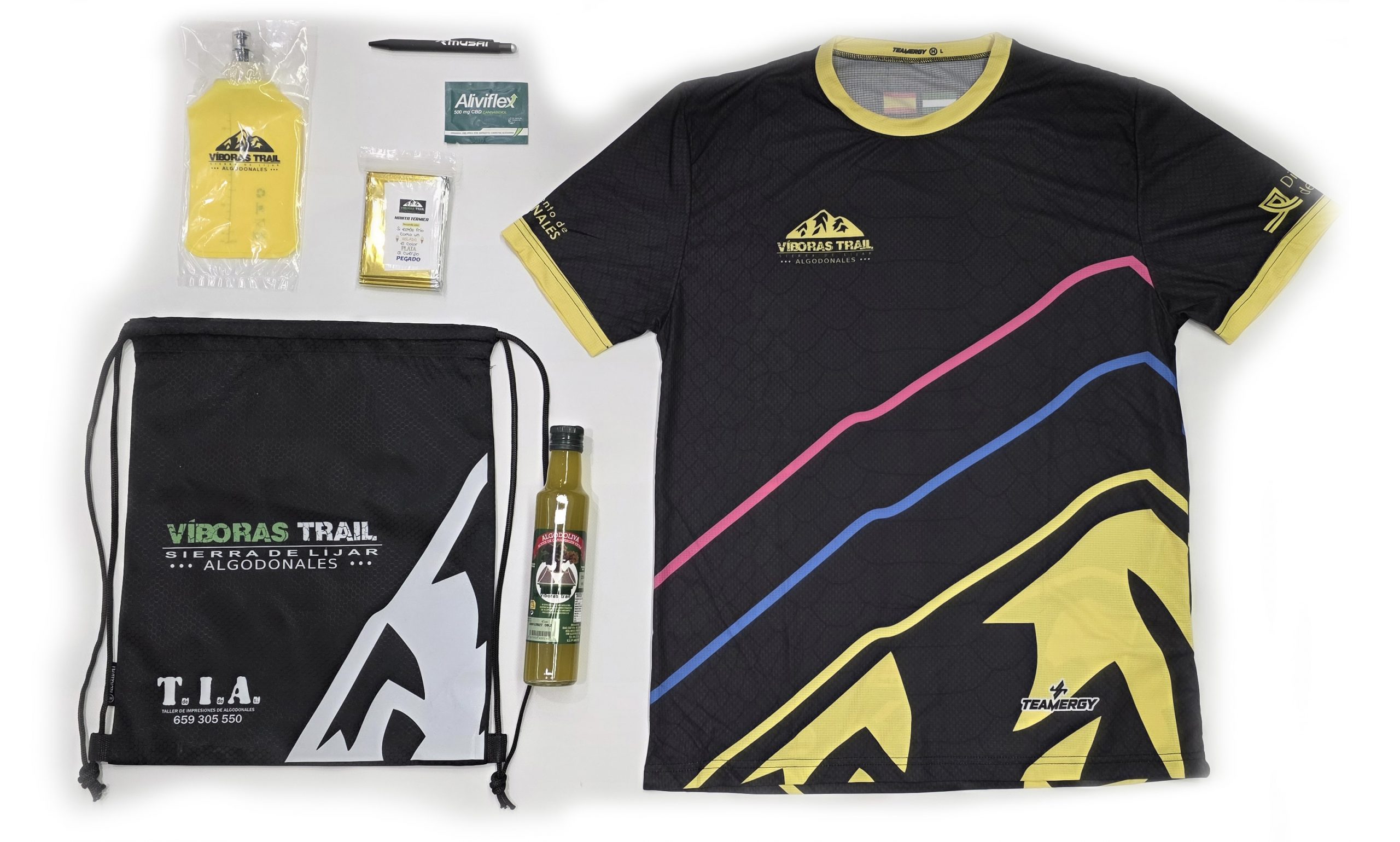 - Camiseta oficial XI edición, medallero Víboras Trail, botella de aceite AOVE Algodoliva y bolsa convertible.